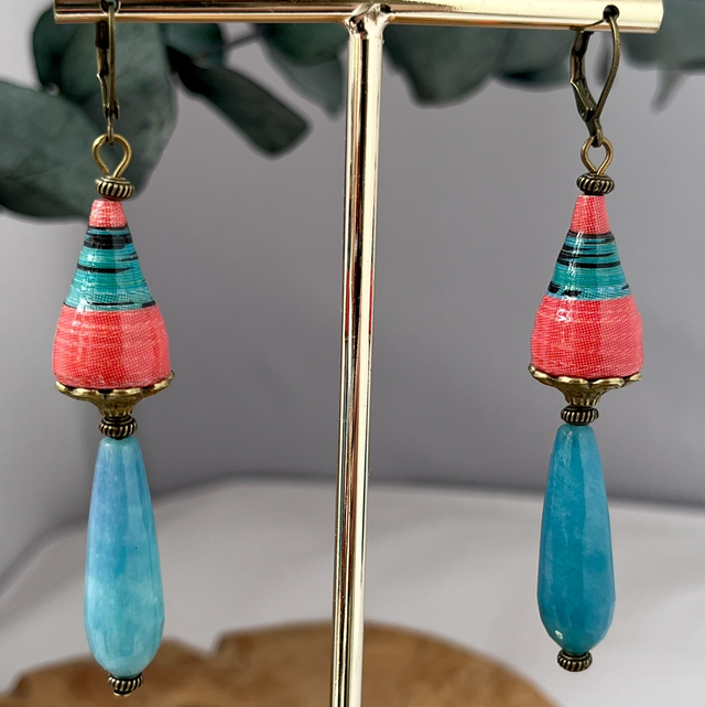 Boucles d’oreilles upcyclées à partir d’une affiche publicitaire. Les perles de papier sont faites à la main et résistantes car triplement protégées.