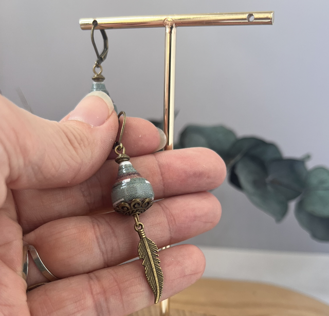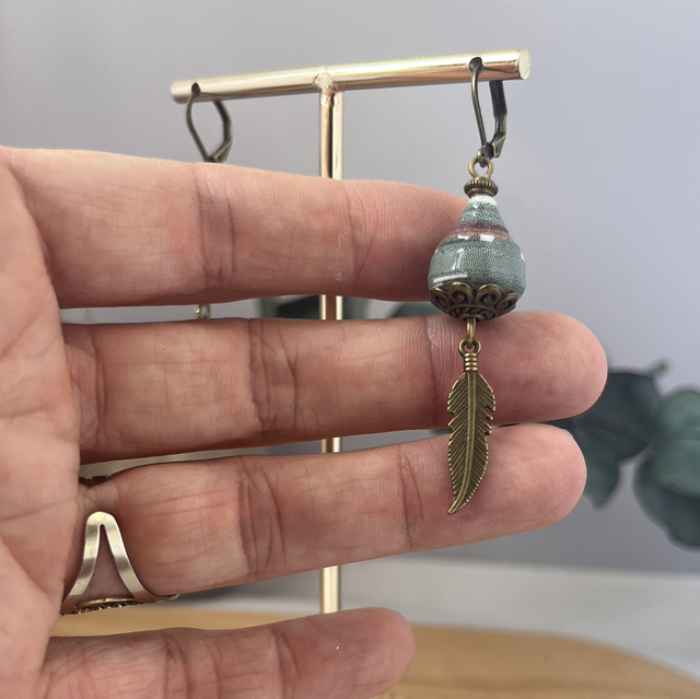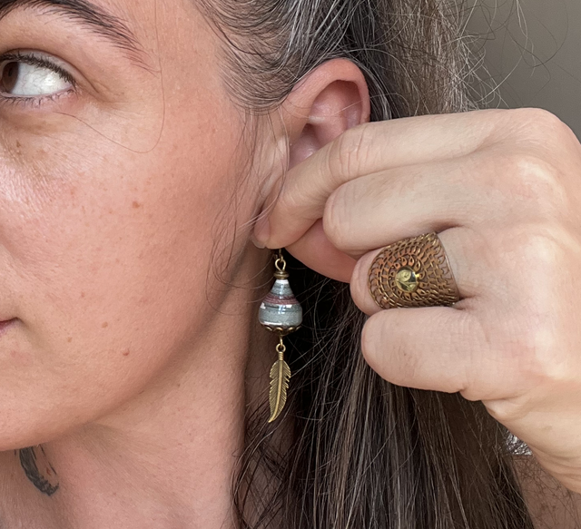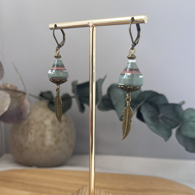Boucles d’oreilles upcyclées à partir de l’affiche sur l’exposition de Bazaar. Les perles de papier sont faites à la main et résistantes car triplement protégées.