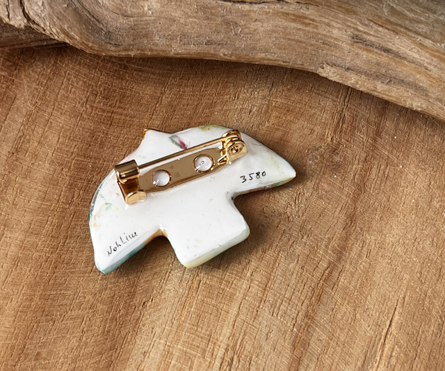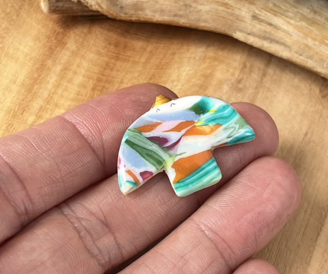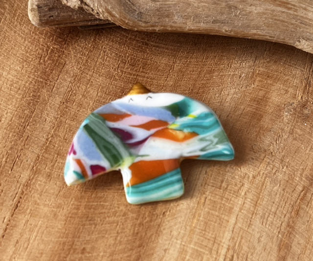 Je vous propose ce Birdy réalisé à la main en argile polymère, le motif est créé directement dans la pâte teintée dans la masse, des détails sont peints à la main et l’ensemble est résiné. L’attache au dos de l’oiseau est dorée à l’or fin.