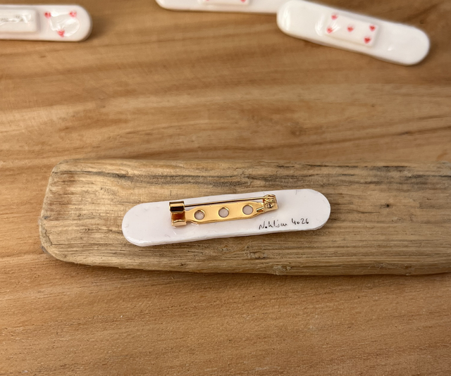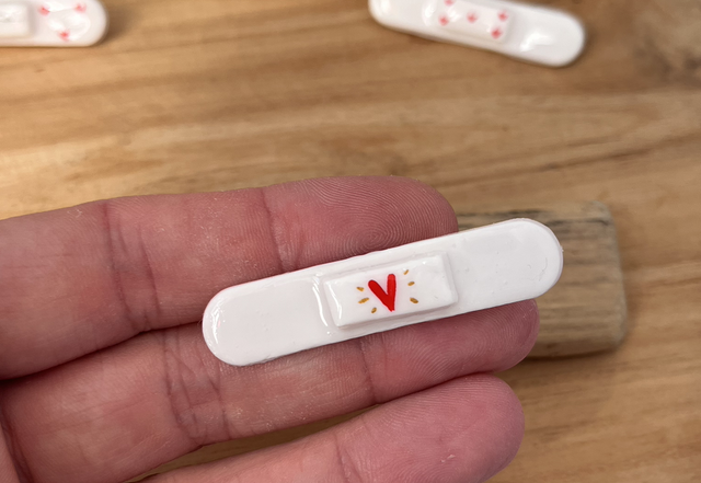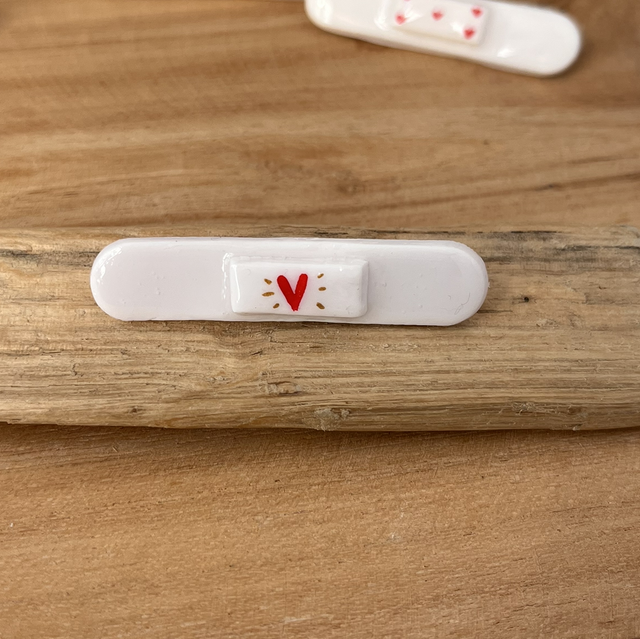 Broche en argile polymère blanc en forme de pansement magique réalisée à la main. Écriture à l’encre de Chine réalisée à la main également.