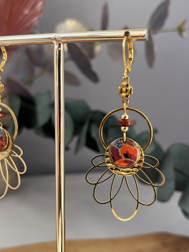 Boucles d’oreilles en acier inoxydable doré et papier traditionnel japonais résiné. Fermeture à dormeuses. Bijoux ultra léger réalisé à la main.