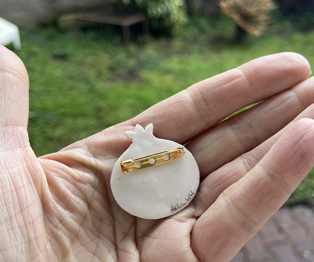 Je vous propose cette broche réalisée à la main en argile polymère, peinte à la main et résinée. L’attache au dos de la bouille est dorée à l’or fin.