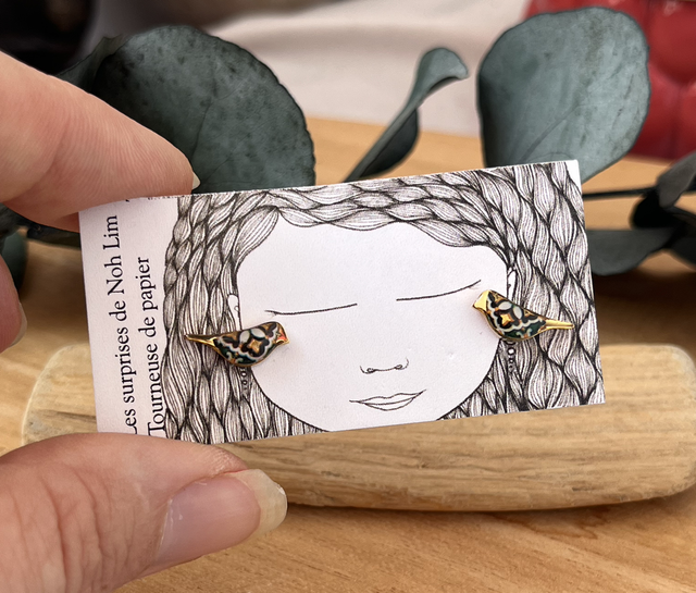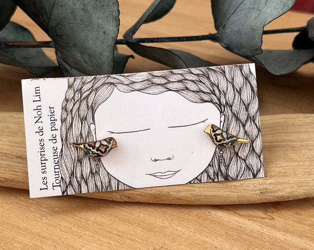 Boucles d’oreilles puces en acier inoxydable doré et papier résiné, réalisées à la main.