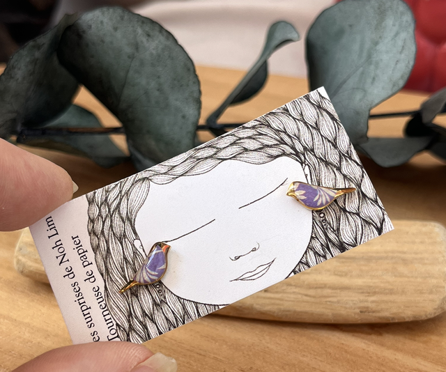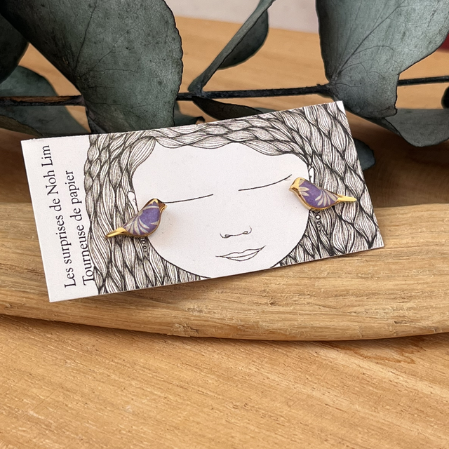 Boucles d’oreilles puces en acier inoxydable doré et papier résiné, réalisées à la main.