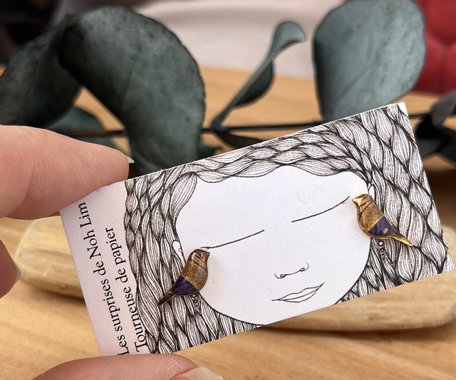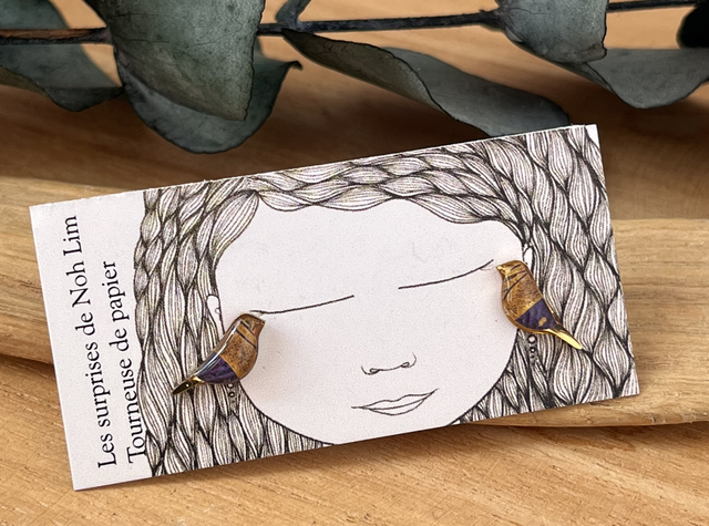 Boucles d’oreilles puces en acier inoxydable doré et papier résiné, réalisées à la main.