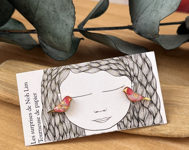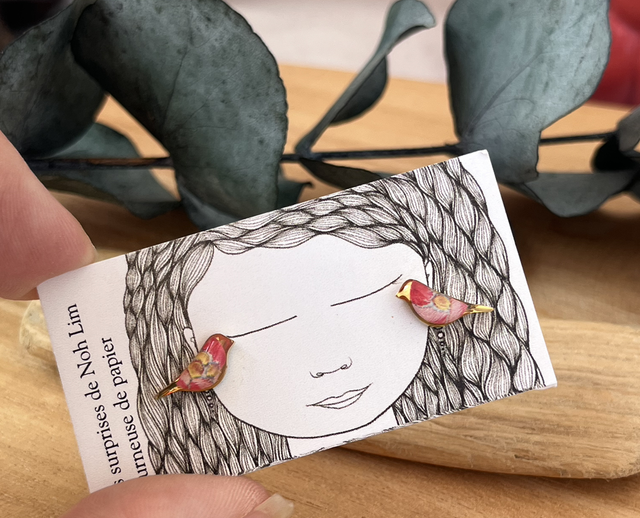 Boucles d’oreilles puces en acier inoxydable doré et papier résiné, réalisées à la main.