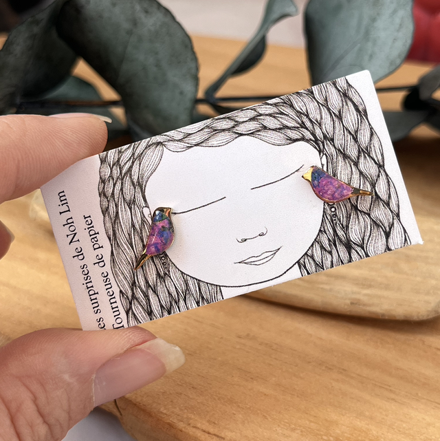 Boucles d’oreilles puces en acier inoxydable doré et papier résiné, réalisées à la main.