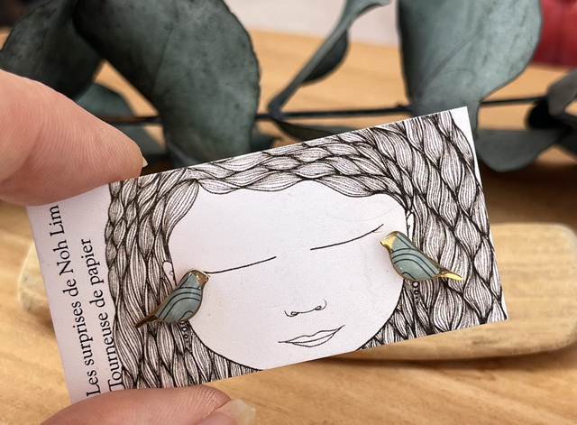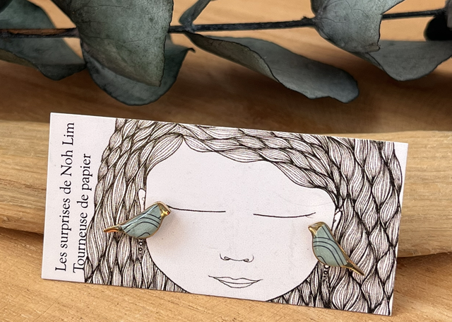Boucles d’oreilles puces en acier inoxydable doré et papier résiné, réalisées à la main.