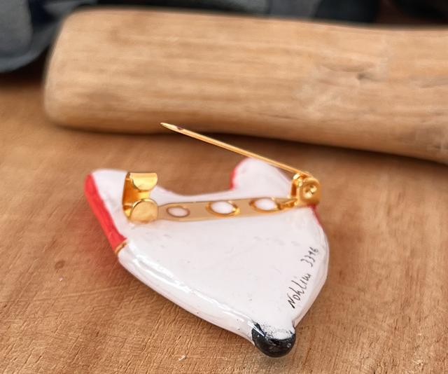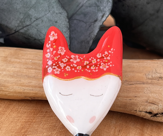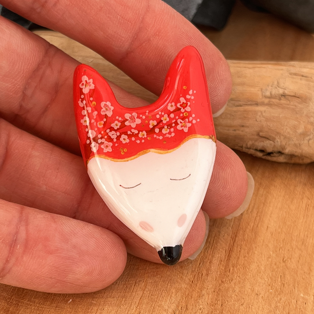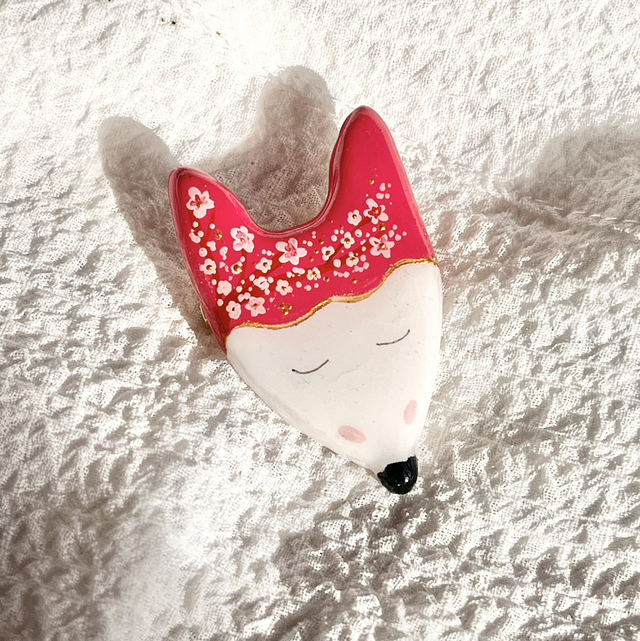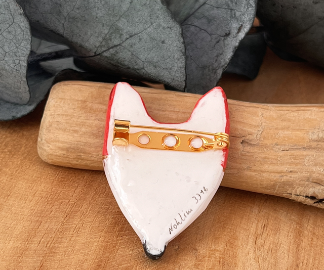 Je vous propose cette broche réalisée à la main en argile polymère, peinte à la main et résinée. L’attache au dos du renard est une broche dorée à l’or fin.