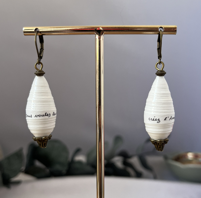 Boucles d’oreilles réalisées à partir de papier, écriture à l’encre de Chine (personnalisable, voir conditions en bas de description).